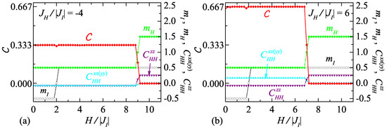 As shown in Figure 2b, both the quantum ferrimagnetic phases and emerge in the ground-state phase diagram exclusively in the parameter region of the ferromagnetic Heisenberg interaction . Naturally, the zero entropy per Ising spin solely can be detected in their stability regions due to unique quantum spin arrangement given by Equation (15a).