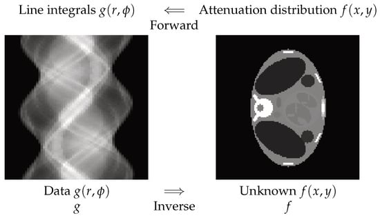 where is the Dirac function; thus, represents the line integrals over the lines of angles of the object function . Forward operation is called projection, and the inversion process is called image reconstruction. In Figure 2, one synthetic example is shown.