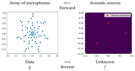 Forward and inverse problems in acoustical imaging. Each microphone receives the sum of the delayed sources’ sounds. The inverse problem is to estimate the sources’ distribution from the received signals by the microphones array.