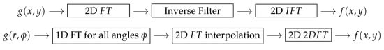 In the second case, the forward model is the radon transform (RT). Using the relation between FT and RT (Fourier slice theorem), the analytical inversion process becomes: