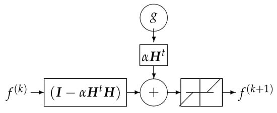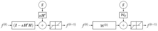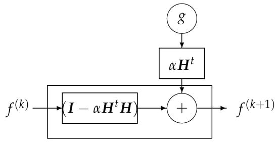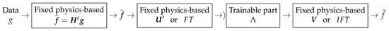 where three of them can be fixed, and only one can be trainable. It is interesting to know that when the forward operator H has a shift-invariant (convolution) property, then the operators U and will correspond to the FT and IFT operators, respectively, and the diagonal elements of correspond to the FT of the impulse response of the convolution forward operator. So, we will have a fixed layer corresponding to , which can be interpreted as a matched filtering, and a fixed FT layer, which is a feed-forward linear network, a trainable filtering part corresponding to the diagonal elements of , and a forth fixed layer corresponding to IFT. See Figure 23.