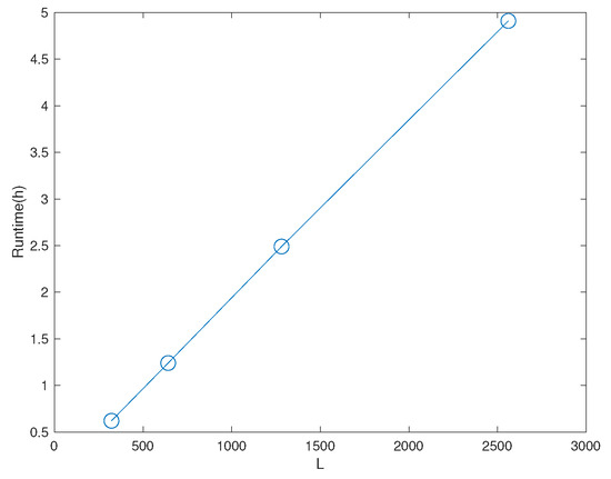 In our experiment, we use samples to define the set . We have also used , and kept based on the considerations of the power constraint at the transmitter. The value L above is chosen depending on the noise variance, with [1281, 2561] in our experiment, by taking into account the tradeoff between accuracy and computational cost. Figure 2 shows the tradeoff between the value of L and the computational cost. The y axis shows the runtime to obtain the result for one point in Figure 8b when are fixed. Its unit is hours.