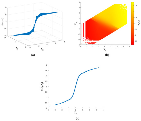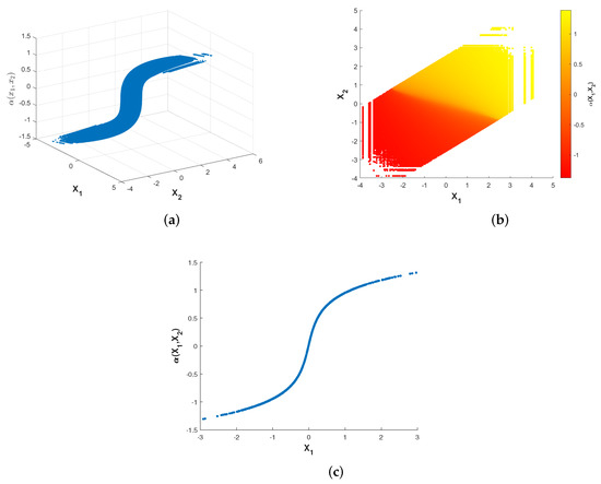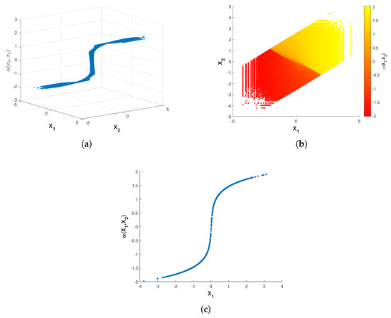 Optimized encoder nonparametric mapping I with CSNR = 0 dB and . (a) shows the curved surface, while the (b) shows the corresponding two-dimensional representation. The (c) shows the curve while .