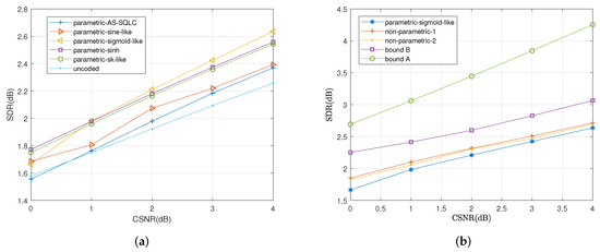 When CSNR increases to dB as shown in Figure 12, the sigmoid-like mapping still yields the best performance within all the parametric mappings, and is inferior to the nonparametric ones, while the gap shrinks with the increase in the correlation coefficient . For large values of the coefficient , the performances of the AS-SQLC and sine-like scheme become closer to those of the proposed parametric mappings, while the uncoded scheme gradually lags behind the AS-SQLC and the sine-like schemes.