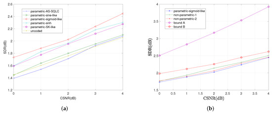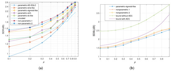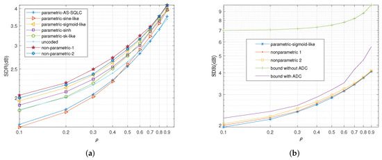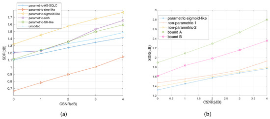 In Figure 8b, we compare the sigmoid-like function (37) and the two nonparametric mappings with the conditional outer bound under one-bit ADC and the outer bound in the case of an infinite resolution ADC front end. Figure 8b shows the performance curves of the proposed parametric sigmoid-like function and two nonparametric mappings in terms of SDR versus CSNR with correlation coefficient . Herein, to vary CSNR, the values of and in (35) are fixed to and 1, respectively, while the average transmitting power is varied. The bound for the scenario with one-bit ADC front end and the bound for the scenario with an infinite resolution front end are indicated in this figure with purple squares and blue circles, respectively.
