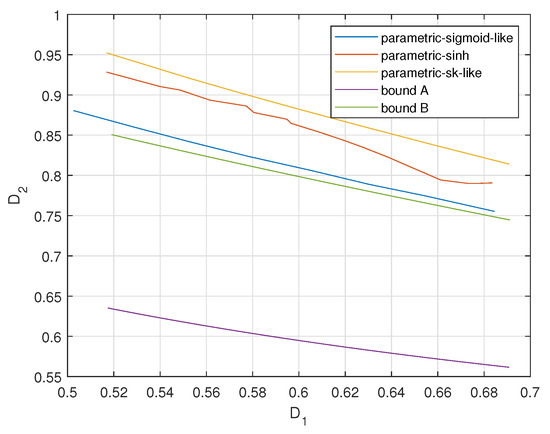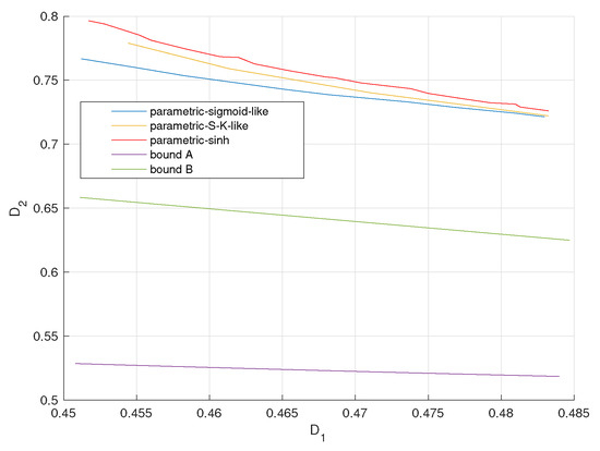 Distortion regions for , , , for three parametric mappings and two bounds.
