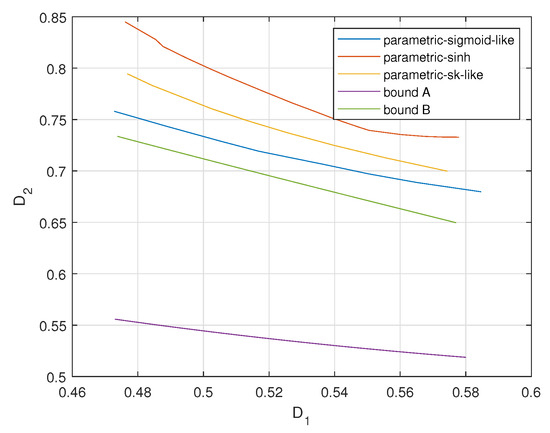 Figure 13, Figure 14 and Figure 15 plot the achievable distortion bounds for three parametric mappings, the bound with infinite resolution ADC front ends and the conditional outer bound with one-bit ADC front ends when different values are assigned to . We would like to emphasize that the bounds we discuss here are not average distortion bounds in previous figures. These bounds are obtained by searching for minimal attainable for given , as shown in (7). They characterize the attainable distortion regions. To plot the - curves for the proposed parametric encoders in Figure 13, Figure 14 and Figure 15, we varied the parameters to obtain a database for - pairs. Then for a given value of , we document the corresponding minimal value of . (It is hard to keep constant in the practical experiments. We obtain the values of around the given one and document the corresponding s. Then the minimum is found within these s.) Finally, we could plot the complete - curves for the proposed parametric encoders.