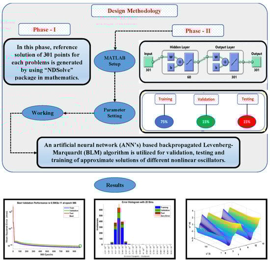 - In the second phase, the BLM algorithm is executed by using “nftool” in the MATLAB package with appropriate settings of hidden neurons and testing data. Further, BLM uses a reference solution and implements the process of testing, training, and validation to obtain approximate solutions for different cases of nonlinear oscillators. Table 1 shows the parameter setting for the execution of the design scheme.