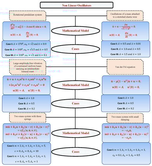 In order to study the performance and efficiency of the design algorithm, various cases of strongly nonlinear oscillators are formulated. Figure 3 presents a complete overview of the different problems and cases studied in this paper.