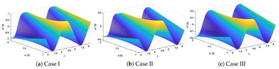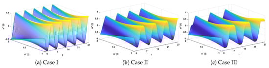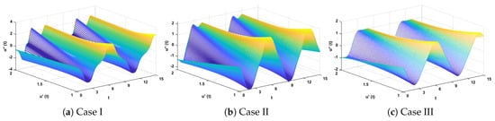 where , l, and g represent the angular velocity, length of weightless rod, and gravitational acceleration, respectively. A simple pendulum oscillates between the symmetric intervals when the revolver is pushed as a constant velocity. The range of values for is assumed to be taken from . To study the effect of variations in Equation (5), the following cases are considered based on the increase in the amplitude of oscillation. Case I: , , and . Case II: , , and , Case III: , , and .