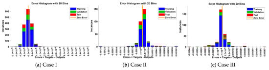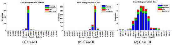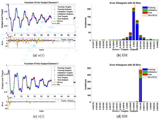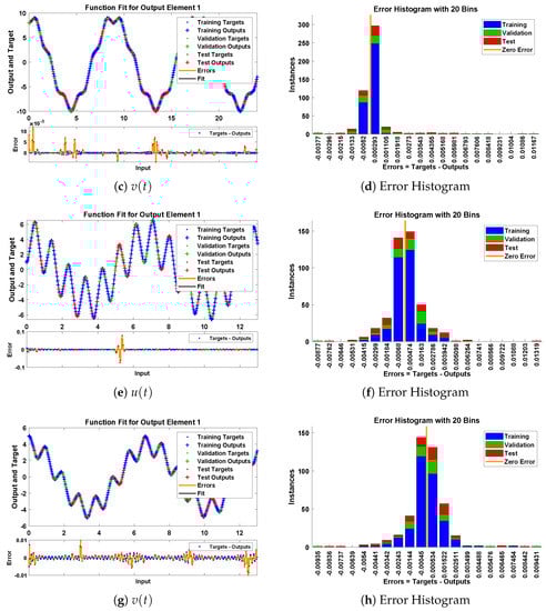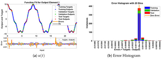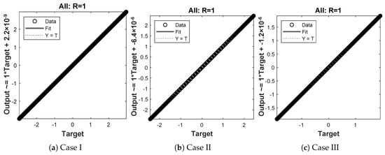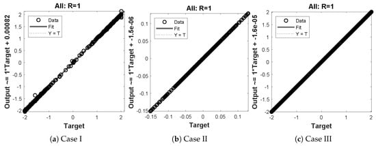 In this problem, the influence of variations in different parameters of the rotational pendulum system has been investigated by using the NN-BLM algorithm. Approximate solutions obtained by the proposed algorithm are compared with He’s Energy Balance Method (HEBM) [39], as shown in Table 2. The results for displacement, velocity, and acceleration are given in Table 3 and graphically shown in Figure 5. Periodic results show that displacement decreases with the increase in time. To study the relation of velocity and acceleration with time, three-dimensional surface graphs were plotted and are shown in Figure 6. The results show that a decrease in the amplitude of oscillation causes a decrease in the velocity and acceleration of the pendulum. Further, to study the effectiveness of the solutions and the efficiency of the design algorithm, error histogram graphs and performance graphs were plotted, as shown in Figure 7 and Figure 8, respectively. The results obtained by the design algorithm overlap with the analytical solution with minimum absolute errors. The absolute error for each case lies around to , to , and to , respectively. In addition, the values of performance function show the perfect modeling of solutions as they lie around , , and , respectively. Statistics of validation, testing, and training of the reference solution are provided in Table 4. Regression analysis is given in Figure 9, which shows the accuracy of the proposed algorithm in calculating approximate solutions.