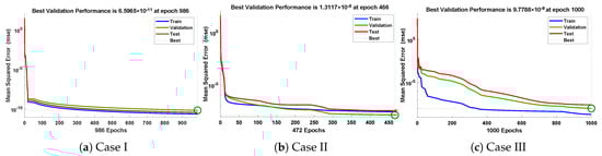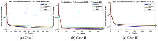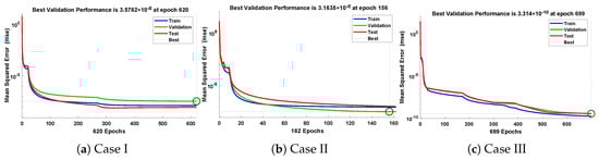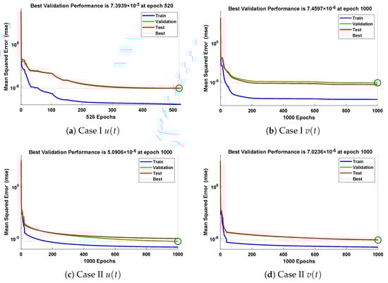 In this problem, the influence of variations in different parameters of mass attached to three springs has been investigated by using the NN-BLM algorithm. Approximate solutions obtained by the designed scheme are compared with targeted data generated from RK-4, as shown in Figure 23. It can be seen that the analytical solution overlaps with the approximate solutions, with minimum absolute errors that lie around to . The results show that a decrease in mass increases the oscillations in the spring. Furthermore, the convergence plots for each case of problem 5 in terms of validation, testing, and training are shown in Figure 24. Statistics of the training parameters are provided in Table 8. Values of performance function for each case are , , , and at epoch 520 and 1000, respectively. Analysis based on regression for each case is shown in Figure 25.