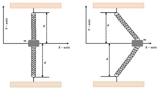 Consider the particle of mass (m) attached to the center of a stretched elastic wire, as shown in Figure 10. The one-dimensional equation of motion for the mass moving in the horizontal direction is given as [15]