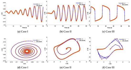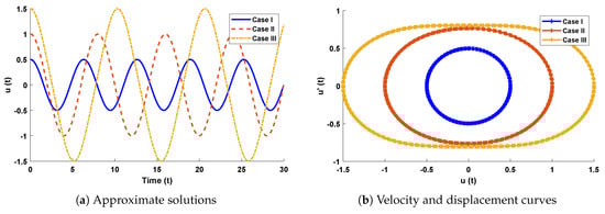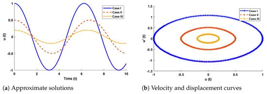 where is a scaling parameter that represents the length of damping and degree of nonlinearity. For , Equation (13) reduces to the equation of simple harmonic motion. Moreover, for and , the system behaves as a damped one. To study the mathematical model of van der Pol oscillators, we have considered the following cases depending on different values of the scaling parameter, i.e., and 10.
