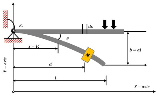 In this problem, we consider a beam with uniform length l and mass per unit length, hinged at the bottom of a rotational spring with stiffness , as shown in Figure 15. The thickness of the beam is considered to be significantly smaller than the length of the beam; therefore, the effects of shear deformation and rotational inertia are neglected [20]. Inclination in the beam due to lumped mass in denoted by and displacement of the beam is given by . Euler–Lagrange differential equations are used to derive a fifth-order Duffing-type model for the motion of the uniform beam carrying an intermediate lumped mass, which is given as