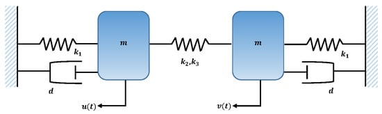 In this problem, we consider a system of two equal masses (m) attached with fixed support and three springs with stiffness , as shown in Figure 22. The equation for the motion of this system in generalized coordinates u and v is given as