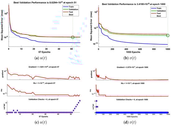 The designed scheme is exploited to determine the fitting of the approximate solutions with numerical results. The curve fitting of the approximate solutions by NN-BLMA for example 6 is plotted in Figure 27. The results are in good agreement with the analytical solutions as the absolute errors of and lie around to , respectively. The performance of the objective function in terms of MSE for obtaining the best fitting is shown in Figure 28. The best validated performance of MSE is , , respectively. It is observed that the value of regression is one, which reflects the accuracy of the solutions obtained by the designed algorithm.