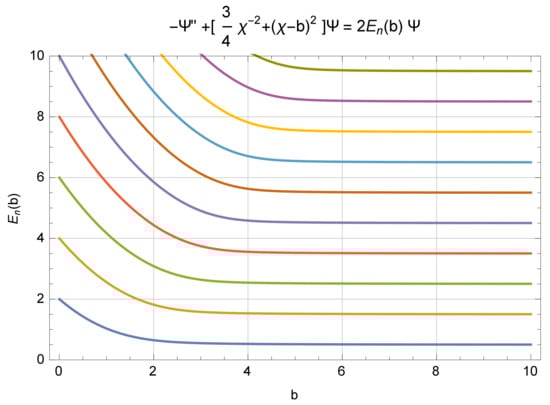 Since AQ is not designed to deal with a full-harmonic oscillator, we immediately admit that AQ fails on the full-harmonic oscillator, and we examine using AQ for a half-harmonic oscillator. Given that and are the classical affine variables, and and , we are led to the affine Hamiltonian , which then leads to the Schrödinger representation . This equation [,] is known as a ‘spiked harmonic oscillator’, and its spectrum and eigenvectors have been established by L. Gouba. It is noteworthy that the spectrum is equally spaced, as that of the full-harmonic oscillator, but with a gap twice that of the full harmonic oscillator. There is an effort to move the end of the active space from to , for . This changes the basic differential equation to become . Figure 1 below, which was developed by C. Handy [], shows clearly how the gap in the spectrum passes from for , and toward , as b grows. As the full set of eigenvectors and their spectrum are recreated when . That result is not available with CQ.