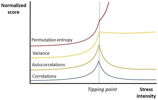The traditional PE measure as explained above does not take the amplitude (or weight) of signal changes into account. Additionally, it is insensitive to signal changes at different temporal scale levels (i.e., high- versus low-frequency components) and highly sensitive to differences in the length of a timeseries and noise artefacts. For this reason, several refinements have been proposed of the original PE measure, which involve calculating weighted PE scores that are compared to white noise (pure randomness) across multiple (coarse grained) temporal scale levels. This refined multiscale reverse weighted (RMSRW) permutation entropy measure can handle noisy timeseries of different lengths, as well as signal changes at different scale levels [25]. By incorporating amplitude, variance, and temporal autocorrelations into a single value, RMSRW-PE covers all aspects that are considered typical hallmarks of critical slowing down (CSD). This means that living systems become increasingly ‘disordered’ prior to their failure, which we argue results from a loss of integrative regulatory connections that normally synchronize system components to produce order (see text). Throughout the rest of this paper, we use the terms PE and ‘disorder’ interchangeably as a more parsimonious term to refer to signal changes in stressed systems prior to their collapse.