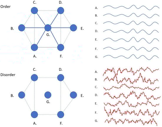 Increased disorder (permutation entropy) may be due to a loss of regulatory connections. The emergence of disorder in timeseries may be due to the loss of regulatory connections that normally synchronize system components (e.g., genes, neurons) to produce order. In this figure, G is a regulatory (hub) node with many connections that synchronize the timeseries of node A–F. The loss of regulatory connections may cause nodes A–F to show autonomous (unsynchronized and, hence, disordered) behavior. The reason for this loss of regulatory connections has so far remained unclear.