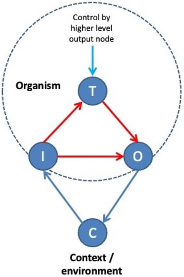 Organisms as control systems. In a very simple model, organisms can be seen as controls systems with an input (I), throughput (T, reference value), and output compartment that interacts with the environment (context, C). The difference between the input (e.g., temperature) and reference value (e.g., the thermostat) is called the ‘error’, which is transferred onto the output module to generate an action that changes the environment. This in turn changes the input to the organism, and the cycle repeats. Thus, organisms iteratively seek out (or create) environments that fit their reference values. Complex (sets of) reference values are called ‘world models’. These encode a complex set of environmental circumstances representing an optimal econiche (see text).