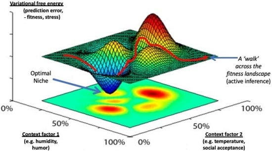 In a seminal paper, Karl Friston used insights from Bayesian information theory to show that prediction error (under some circumstances) is equal to the mean amount of ‘variational free energy’ across time of a living system, such as a cell or a brain [48]. This means that when organisms try to iteratively reduce their prediction errors through active inference, they are actually trying to reduce their free-energy levels across longer timespans. In this respect, they are not much different from crystals in which ions arrange themselves into highly ordered patterns, despite the fact that all objects in this universe need to obey the second law of thermodynamics (which states that they must seek a state of maximum disorder, i.e., high entropy). For quite some time, it was thought that crystals violated the second law of thermodynamics, until it was discovered that crystallization produces heat that dissipates into the environment, producing a global increase in entropy (and free energy) levels [49]. Additionally, the ordering of ions into neatly arranged lattices in many cases allows water molecules to move more freely through the system, which adds to the global amount of disorder (and free energy) of the universe. Thus, scholars realized that objects may arrange themselves locally into more ordered (low-entropy) states as long as this allows for a global increase in entropy and free energy. Despite the necessity that everything in nature eventually needs to revert to a state of high disorder, living systems have found a way in which they can maintain their circumscribed form and stable state (i.e., order) at least for some period of time, by having found the most efficient way of losing (dissipating) their free energy to the environment, which is to reduce prediction error [37,50,51]. Similarly, an organism can be compared to a ping-pong ball that rolls into a pit in order to keep its potential (free) energy as low as possible: that ball simply has no choice, since it needs to obey the second law of thermodynamics, which states that any object may seek a local state of low free energy and entropy (the bottom of the pit) as long as this leads to a global increase in entropy levels of the universe (in this case, the act of rolling into the pit increases the global freedom of the individual molecules of the ball in the form of heat, which subsequently dissipates into the environment [52]). In living systems, the basin of the pit corresponds to a state of low entropy (prediction error or variational free energy) that is called ‘homeostasis’ [37]. Active inference can, therefore, be seen as a walk across a free-energy landscape, in which organisms actively try to roll into pits of low variational free energy that represent high levels of niche model ‘fitness’ (homeostasis) (Figure 4). In most cases, such low-energy states correspond to organisms occupying their locally optimal econiches. The whole process of seeking stability through change thus follows from the basic laws of thermodynamics [51]. Friston has found a series of equations with which to describe this process that do not only apply to life in general, but to all objects in this universe that are required to dissipate their free-energy levels as efficiently as possible [53]: a true ‘Theory of Every Thing’ [54]. In a way, this theory says something we already knew for quite some time: by actively searching for optimal niches (minimizing prediction error), living systems can reach homeostasis (a stable state of low mean variational free energy) and survive (remain intact). The novelty is that we now have mathematical equations with which to describe this process, which may apply to any object in this universe.
