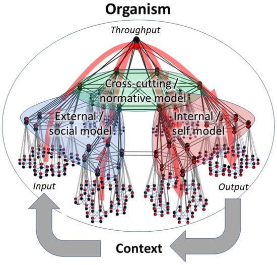 For a long time, it was thought that organisms only construct these two global models, i.e., internal (self) models and external (social) models. In our recent paper [21], we demonstrated that the principle of hierarchical Bayesian inference logically (and necessarily) dictates that there must exist a third, highest level of inference, whose job it is to infer the hidden common causes behind events that involve both the internal and the external world of the organism, across multiple context factors in both space and time. In short, there must be an overarching model that integrates across self and social models to encode a commonly held world model (a common econiche) (Figure 6). Prediction errors relative to such models inspire actions that are aimed at affecting this common econiche rather than the local, internal, or external (social) niches of the organism itself. Although in theory, knowledge of a ‘common ground’ can be used solely to the advantage of an individual organism or local group, such knowledge is unlikely to produce strictly selfish policies since any type of behavior that favors a global goal (i.e., promotes global stability) eventually also favors individual organisms and local groups (i.e., promote local stability). Especially in higher social species, the vertical outgrowth of overarching models allows organisms to produce increasingly sophisticated models of common econiches across increasingly lengthy periods of time. Prediction errors relative to such models inspire behavior that is aimed at promoting long-term collective stability, such as an equal sharing of energy and resources across multiple stakeholders (e.g., collaboration, food sharing, and other forms of distributive justice), resolving conflict situations (e.g., mediation or arbitration), or holding each other responsible when goals are violated that apply to all members of the community (punishment for norm violation and other forms of justice). Normative or law-abiding behavior of this kind (including altruistic behavior) has been observed in some form or another in a wide range of organisms, from unicellular organisms and invertebrates to higher vertebrates and mammals [96,97,98,99,100]. Whereas a clear self–other dichotomy seems to mark the distinction between kinship selection (i.e., the favoring of kin over others, nepotism) and reciprocal altruism (i.e., investing in unknown individuals) [101], the hierarchical expansion of overarching world models seems to soften the self–other dichotomy by pushing behavior toward an increasingly inclusive (social) space and toward ever larger (transgenerational) timescales, i.e., devoting time and energy to improve the stability of unknown future individuals and species [102,103,104,105,106,107]. Such overarching world models allow organisms to escape the polarization or nepotism that is inherent to local self-referential or interpersonal goals by appealing to commonly held niche models that are invariant across generations. Especially in social organisms where regulatory hierarchies have reached high levels of sophistication, such shared setpoints may take the form of community norms or values [106,107,108,109,110]. Such goals promote social cohesion between large numbers of individuals across substantial individual differences and substantial spatial and temporal boundaries [111]. Even the ability to see all of life as connected under such common laws and insights (which includes religious insights and corresponding feelings) may be caused by this highest level of inference (e.g., [112]). In this respect, it is interesting to note that ‘religare’ originally means ‘to reconnect’ in Latin (across individual differences and timeframes, under a common highest law), that Catholicism means ‘(moving) toward a whole’, Islam means ‘order/peace through submission (to a higher law)’, and ‘hierarchy’ refers to ‘holy ordination’ in ancient Greek. In short, organisms are likely to be engaged in a highest level of inference at the top of their goal hierarchies, which tries to infer what the organism “should be doing”. Such overarching (normative) world models are not restricted to higher organisms, although organisms with more sophisticated goal hierarchies do tend to show more sophisticated forms of behavior (see previous section for a definition).