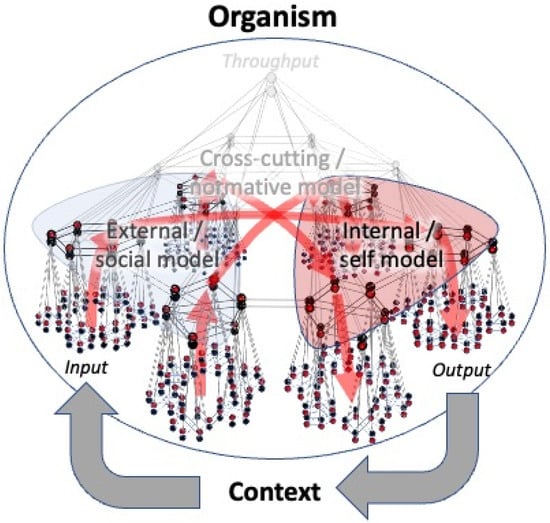 Organisms are known to construct at least two distinct types of world (econiche) models at the top of their goal hierarchies: models of their external environments and models of their internal environments [85]. Such models inspire behavior that purports some sense of agency, i.e., the ability to distinguish between events that are generated by the organism itself versus events that have their origin outside of the organism [86,87]. The former include signals that arise within the body of the organism, as well as signals out of the body that have been produced by the organism itself, such as sounds or vibrations due to its own movement [86]. Basic forms of self (versus non-self) encoding have been observed even at the level of bacteria and may take more elaborate forms in higher mammals [88]. Such models increase in contextual richness when they gain in complexity and hierarchical depth, which appears to underlie the distinction between ‘higher’ and ‘lower’ species [37,51]. Self-models may include any form of self-representation, such as a body image and a psychological self-image [89]. Such models encode self-referential (personal) goals that the organisms would like to occupy or sample. Prediction errors with respect to such global goals inspire behavior that is aimed at achieving these goals through a logical series of subgoals and corresponding behavioral policies [72]. For instance, the global goal of catching food requires the global policy of hunting, which consists of subpolicies such as hiding, freezing, fighting, and eating. Reaching such goals involves the mastery of personal skills that vary from hunting and gathering and building nests to finding shelter and mastering survival skills (or occupational skills in humans). The growing mastery of such skills is referred to as self-actualization or the development of agency [87,90,91,92,93]. Especially in higher social mammals, models of the external world include social models (‘theories of mind’) [92,94]. Such models try to infer the hidden common causes behind multiple signals in the external world that are produced by other organisms, i.e., the intentions and motives of friends, rivals, mates, or kin [92]. Prediction errors relative to such models inspire behavior that is aimed at achieving personal or interpersonal (social) goals by taking these motives into account. Such actions may involve e.g., offensive or defensive actions, courtship rituals, parental investment, or nursing behavior. The increasing mastery of social skills is called social learning [95]. Note that even some forms of antisocial behavior (e.g., deceit or fraud) require the presence of social models, since such behavior requires some degree of knowledge of the intentions of others, which is used to one’s own advantage. Regardless of the type of species, self-models and social models involve more integrative (goal-directed) forms of inference that occur at higher levels within a goal hierarchy (see previous section and Figure 5). In our recent paper [21], we showed that external (social) models are likely to form the top of the input hierarchy, since these are involved in inferring ‘what the outside world is doing’. Following the same line of reasoning, internal (self) models are thought form the top of the output hierarchy, since these are involved in inferring ‘what the organism is doing’. These assumptions are confirmed in the human brain [21], but require confirmation in other species. Since the timescale of events is encoded vertically in hierarchical networks [69,70], the vertical outgrowth of self and social models allows organisms to incorporate increasingly long-term predictions with respect to increasingly abstract personal or interpersonal goals. For instance, self-models and social models in higher primates have reached a level of sophistication that allows them to imagine and work toward complex social positions across many years of time.