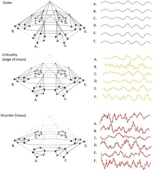 Explaining disorder and tipping points in stressed systems. The balance between order and disorder of a system is at last partially controlled by the coupling of subsystems by central connectors (hub units). Disorder (including disease) may result from a loss of centralized and integrative coupling that is caused by a top-down collapse of hierarchical control systems, due to hub overload and failure. This causes a loss of coherence and increased variance at lower levels within the hierarchy that translate into increased levels of permutation entropy scores (see text). Organisms self-organize toward a dynamic state in between complete order (i.e., perfect synchrony of timeseries A–F; upper picture) and complete disorder (i.e., perfect randomness of timeseries A–F; lower picture). This equilibrium state is called self-organized criticality (SOC; ‘the edge of chaos’; middle picture). A loss of higher (integrative) hierarchical levels of control may shift this equilibrium toward the disordered side of the spectrum. Although stress levels may rise gradually, the loss of high-level central control by a cascading failure of high-level hubs structures is a discrete process, causing discrete transitions from order to disorder. A stress-induced loss of hub structures may, therefore, explain sudden phase transitions that mark the onset of physical or mental dysfunction, disease, or death. See text for further details.