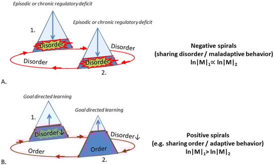 Recent studies have shown that the free-energy principle can be used to model information transfer in social networks of animals and humans (i.e., communication patterns) [159,160]. A model has been proposed in which one individual monitors the behavioral output of another in order to infer the hidden common causes behind the observed behavior (i.e., its meaning or intentions). In order to read their mutual intentions, organisms must synchronize their responses, which in this view defines a social tie. Predicting the intentions behind another person’s behavior becomes increasingly difficult when the observed behavior becomes increasingly unpredictable. This may happen when a subject’s world model flattens to the point where the corresponding behavior of the individual loses its hierarchical correspondence with the actual state of the world. Such ‘maladaptive behavior’ is marked by high levels of permutation entropy (disinformation, low levels of predictability, see Section 1). This can be the case, e.g., in psychiatric patients with affective or psychotic disorders, in which the connection between the outside world and observed behavior does not seem to make sense (i.e., is unpredictable). When the behavioral output of some individual is sufficiently unpredictable (maladaptive), this may raise prediction error (stress) levels in another individual to the point where it causes the goal hierarchy of this new individual to collapse and the individual to show unpredictable (maladaptive) behavior of his own. Such ‘disorder’ may consequently be conveyed upon yet other individuals or feed back to the first individual to form a closed loop. Thus, disorder (disinformation) may spread through social networks (Figure 9). In an extreme example, individual 1 may be highly annoyed by the loud music produced by individual 2 (their stressed-out neighbor). This raises stress levels to the point where it causes a collapse of hierarchical control in individual 1, who is subsequently unable to factor in the needs of individual 2 (e.g., pay them a visit when they need help). Based on their decontextualized models, individual 1 then decides to make some noise of their own, keeping individual 2 (and perhaps some others) awake and removing any residual levels of control that individual 2 might have. Individual 2 then gets back at individual 1, etc. Thus, people may hold each other captive in complex webs of underregulated reflex arcs that are self-sustaining and difficult to extinguish, since they are insufficiently suppressed by more sophisticated (contextualized and socially inclusive) world models (Figure 9A). This can be compared to a neurological clonus, which is a disinhibited reflex that sustains itself by means of its own motor response, which serves as a trigger for a novel response. Such pathological reflexes are caused by the disappearance of higher-order regulatory functions (e.g., by a tumor or an infarction) that normally suppress the primary reflex arc. Similarly, the ‘social clonus’ may cause strong loops in social relationships (such as intense interpersonal conflict or symbiotic relationships) due to a lack of top-down regulatory constraint. Indeed, several studies have shown that emotional states such as (un)happiness and loneliness or mental illness such as major depression may spread through social networks in ways that are analogous to infectious disease, although a general mechanism for such ‘social contagion’ seems to be lacking [161]. The free-energy principle may explain such effects in terms of the spread of (dis)information through social networks in the context of insufficient hierarchical control.