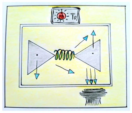 Pictorial representation of the non-Hermitian quantum single-molecule junction (nHQSMJ) model. The leads are represented by two gray triangles. The spring portrays the molecule connecting the leads. The arrows with the cyan cusps depict the state of the two-level system (TLS), depending on its position along the junction. When the TLS is in the left lead, the arrow points downward. As the TLS moves toward the right lead, the arrow rotates until it reaches the upward position, which implies a complete transfer to the right lead. The sink below the right lead absorbs the TLS probability in an irreversible way. In the formalism, the sink is represented by a Hermitian decay operator. The decay operator acts on quantum states that in turn determine probabilities. Hence, the action of the sink unfolds upon an ensemble of trajectories of the TLS system. The picture also shows a box separating the molecular junction from the environment. The drawing of the box resembles on purpose that of an oven with a thermostat on top. The thermostat temperature is set at the same value of the temperature of the environment. The thermostat controls the temperature inside the oven so that it is equal to that of the environment. The yellow color inside the oven and around it, in the environment, conveys the idea of thermal equilibrium.