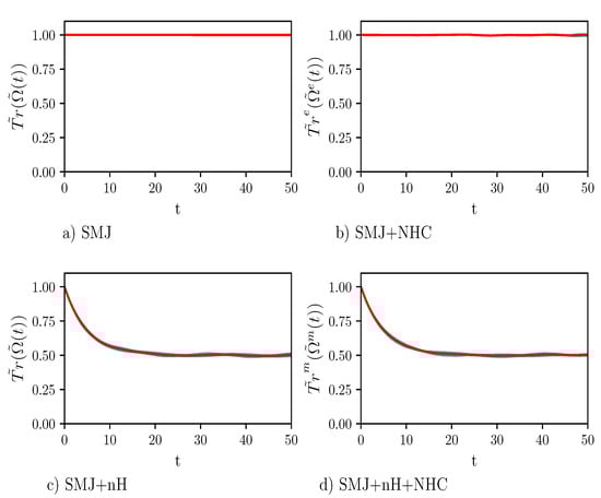 Plot of . The values of the parameters of the calculation are: number of time steps = 10,000, number of Monte Carlo points , time step , , , , coupling constant , and inverse temperature . The red line shows the average trend while the cyan area around it, which is hardly visible, displays the statistical error of the calculation. Panels (a) and (b) show the results of the calculations when the dynamics takes place for the isolated single-molecule junction (SMJ) dynamics and for the SMJ dynamics at constant temperature, i.e., SMJ+NHC dynamics, respectively. Panel (c) shows the result of the calculation when a decay operator acts onto the SMJ, which is for SMJ+nH dynamics. Finally, in Panel (d) all types of dynamics are considered together, i.e., SMJ+nH+NHC dynamics. It is easy to see that the trace is conserved when the Hamiltonian is Hermitian. Instead, the population drops to about one half in the case of nH dynamics.