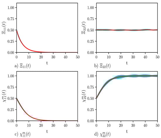 In Figure 3 we show the time-evolution of and , with , defined in Equations (59) and (60), respectively. Panels (a) and (b) display and , respectively. Initially, adiabatic states are equally occupied. However, according to Equation (40), only the occupation of the excited state experiences depletion, see in Panel (a). Panels (c) and (d) of Figure 3 show and , respectively. The behavior of is hardly distinguishable from that of . However, the situation is different for in Panel (d). As a matter of fact, while is constant, increases so that .