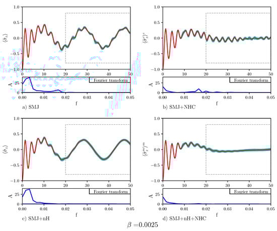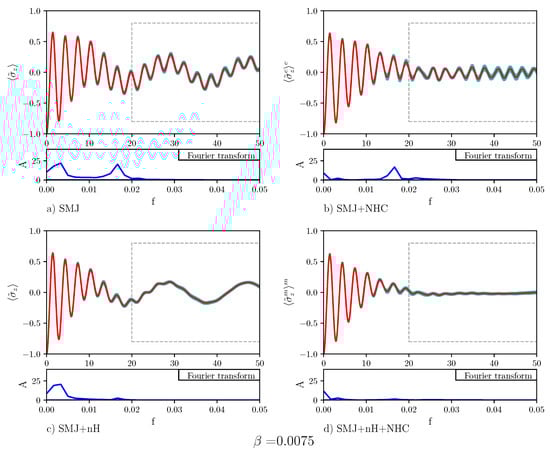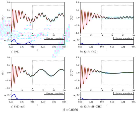 The plot shows the average population transfer vs. time for different types of dynamics. NMDS = 10,000, NMCP = 2500, , , , , , and . The red line is the average trend, the cyan area is the error. The blue line is the Fourier transform, carried out after the stabilization of the trend (from onward). In Panel (a) the population difference oscillates with low and high frequency contributions (for SMJ dynamics). Panel (b) shows that the thermostat (SMJ+NHC dynamics) facilitates the population transfer and stabilizes it more than in the case of lower temperatures. The low frequency terms are highly damped while the high frequency ones are unaltered. Panel (c) shows that the effect of the decay operator (case of the SMJ+nH dynamics) is to cancel the high frequency term. Finally, Panel (d) shows that the SMJ+nH+NHC dynamics displays a stable transfer: Both the low and the high frequency terms are strongly damped.