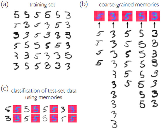 We show how to identify a set of coarse-grained symbols or memories able to correctly classify training-set data by capturing the diversity of the set of symbols while omitting redundant objects [see Figure 1b]. In this context, “coarse-graining” means combining symbols into groups and identifying their centroids, to produce a sparse description of configuration space; it does not mean sampling images at lower resolution. The process of coarse-graining is similar in spirit to the process enacted by particle-clustering algorithms [23,24,25]; by a supervised k-means algorithm [26]; and by learning vector quantization classifiers [19] such as the growing neural gas [18] or growing self-organizing network [20]. For MNIST or Fashion-MNIST data, a set of N training-set symbols can be described by a set of about or memories, respectively. Memories classify unseen test-set symbols, via nearest-neighbor classification, as accurately or slightly more accurately than do the symbols from which they are derived; a natural expectation is the opposite [21].