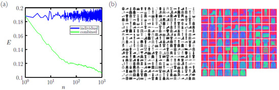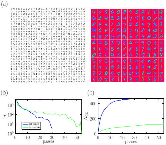 The coarse-graining algorithm used here is a method of clustering, resembling a particle-clustering algorithm [23,24,25] or a supervised version of the k-means algorithm [26]. It can also be considered to be a type of genetic algorithm: two parents (a symbol and a memory) produce offspring (a memory) that is retained only if it passes a fitness test (recognizing the parent symbol better than does any other memory). This latter feature suggests that memories can be specialized (made “fitter”) for particular tasks by varying the environment in which memories are made. In simulations described thus far we have used batches that contain, on average, equal numbers of symbols of all types. In “harsher” environments, i.e., batches that contain only symbol types that are easily confused, we speculate that memories must be fitter to survive. Some evidence in support of this speculation is shown in Figure 3b: a batch of 3000 symbols containing only 1 s and 9 s requires more passes of the coarse-graining algorithm than does a similarly sized batch containing all symbol types, suggesting that the coarse-graining algorithm has to work harder to partition configuration space accurately when only similar symbol types are present (This batch of 3000 symbols was coarse-grained to produce 119 memories (in 23 s on a 3.1 GHz Intel Core i7 processor); this set of memories achieves a nearest-neighbor classification error rate of on the -MNIST test set, misclassifying 7 out of 2144 symbols.).