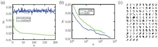 Sampling. (a) Error rate E achieved on the MNIST test set using n memory sets in parallel (see Figure 4). Each set (which contains about 750 memories) was obtained by coarse-graining batches of 5000 symbols drawn from the MNIST training set. No single memory set does better than about 5% error rate on the MNIST test set (blue line). However, in combination they are much more potent (green line). 10 sets (about 7500 memories in total) scores 2.8%, equal to the rate achieved using all unaltered training-set symbols (see Figure 2). With about 200 sets the error rate falls to 1.6%. (b) Further improvement is possible with better measures of image similarity: the green line is reproduced from panel (a), while the blue line was obtained using linear shifts of symbols. (c) The memory sets used to produce panel (b) together classify the MNIST test at 1.14% error rate; we show here the 114 misclassified symbols.