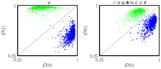 2 batches of 5000 symbols, of type 0 and 1 or 0 and 6, are coarse-grained and used to classify the - or -MNIST test set, respectively. Horizontal and vertical axes show the largest overlap between a test-set symbol and the relevant memory type (symbols of type 0 are shown blue). Misclassified symbols are shown at the top of each plot.