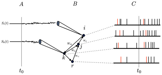 where K decays sufficiently fast at infinity (in space and time) to ensure that the integral is well defined. K mimics the receptive field (RF) of the neuron. In general, the response of spiking neuronal networks to a time-dependent stimulus does not only affect rates, it also has an impact on higher-order correlations between neurons, because neurons are connected through synapses. This situation is sketched in Figure 1.