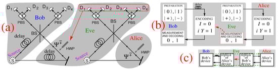23], as follows. She puts Bob’s photon in a qm (delays it in the fiber coil) and makes use of a copy of Bob’s device to send Alice a photon from a down-converted pair in state