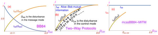 To summarize, we considered man-in-middle (MITM) attacks on two kinds of two-way QKD protocols (pp with entangled photons and LM05 with single photons) in which an undetectable Eve can decode all the messages in the message mode (MM) and showed that the mutual information between Alice and Bob is not a function of disturbance in the MM, since there is no disturbance in the MM, but is equal to unity no matter whether Eve is in the line or not. Eve induces a disturbance () only in the control mode (CM). In a way, Alice’s sending of the key is equivalent to sending an unencrypted plain text (via photons obtained by and returned to Bob) secured by an indicator of Eve’s presence. That burdens the protocols with the following drawbacks under a MITM attack: