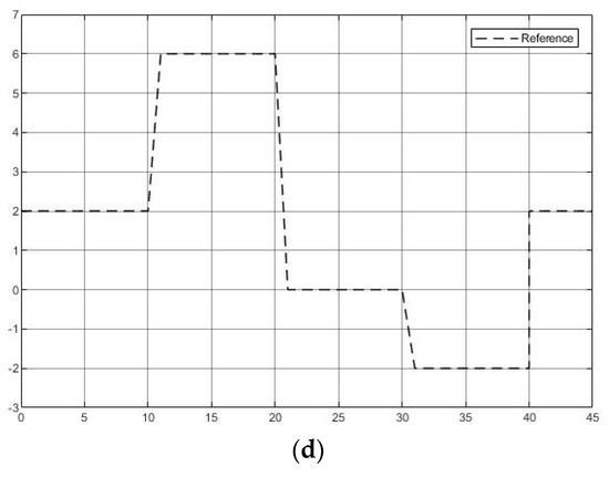 Figure 9. Simulation results of plant2 (a) System outputs; (b) Tracking errors; (c) Controller outputs; (d) Tracking reference.