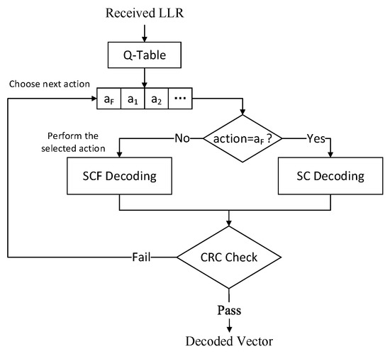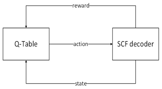 The Q-learning algorithm can be used in the SCF decoding, because the selection procedure of candidate bits is modeled as the MDP process. Selection of candidate bits can be seen as a decision process in general. For the SCF decoding, the decision of the Q-learning is how to select one bit from candidate bits to make the decoded codeword correct.