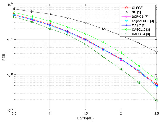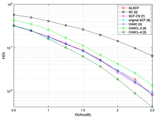 Figure 5, the simulation result shows that the performance of the proposed QLSCF algorithm is better than that of both the CASCL-2 Algorithm and the SC Algorithm. The FER performance of the proposed QLSCF algorithm is less than that of the CASCL-4 decoding algorithm in