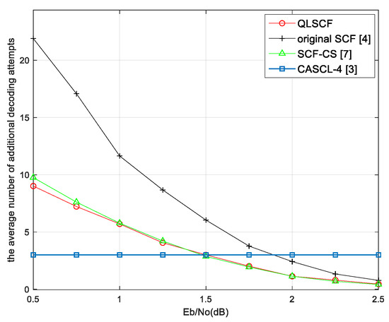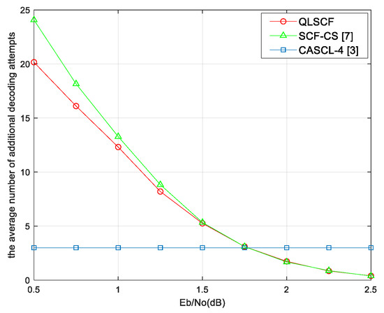 Figure 7 that the average additional decoding attempts of the QLSCF algorithm are reduced compared with the SCF-CS decoding algorithm when SNR is less than 1.5 dB. At high SNR, the average additional decoding attempts of the proposed algorithm are the same as that of the SCF-CS decoding algorithm in