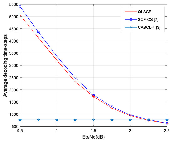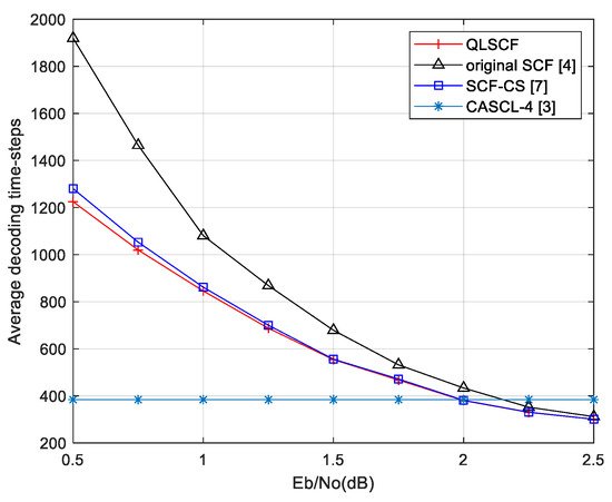 The number of additional decoding attempts is different for different decoding algorithms. In order to intuitively illustrate the comparisons of the QLSCF decoding, the original SCF decoding and the SCF-CS decoding algorithm, the total decoding delay is obtained by counting the average decoding time-steps. The decoding time-steps of the proposed QLSCF algorithm are compared with that of other algorithms in