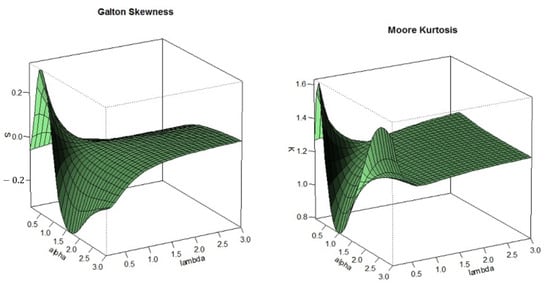 Three-dimensional plots of Galton’s skewness and Moore’s kurtosis for various values of and .