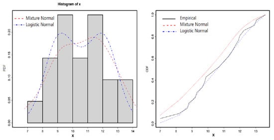 In this subsection the LN distribution is fitted to a bimodal datasets using ML method. The dataset is obtained from National Data Buoy Center (NDBC). It represents the number of buoys situated in the North East Pacific: Buoy 46,005 (46 N, 131 W) for the time period 1 January 1983 to 31 December 2003. The data is available from [1]. The Histogram in Figure 4 shows that the distribution of the data possesses a bimodality shape, for this reason, we fitted the dataset to both LN and the mixture normal distributions. The results of the maximum likelihood estimates, the log-likelihood value, the AIC (Akaike Information Criterion) and the Kolmogorov-Smirnov (K-S) test statistic for the fitted distributions are reported in Table 2. Figure 4 displays both the empirical and the fitted cumulative distribution as well as the probability density functions for the fitted distributions. The results in Table 2 indicate that the LN distribution outperforms the mixture normal distribution. In fact, the fitted CDF in Figure 4 shows that the mixture normal distribution does not provide an adequate fit. The fact that the LN distribution has only three parameters adds an extra advantage to the distribution over the mixture normal distribution.