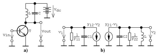 where yjk are admittance parameters of a bipolar transistor considered as two-port in a common emitter configuration and the state vector is . Symbol c1 represents a parasitic base-emitter capacitance and c2 is a sum of parasitic collector-emitter capacitance and working capacitance of the parallel resonant tank. Resistor R2 given in the schematic could contain both the output admittance of transistor y22 and inductance resistive losses. In practice, entries of 2 × 2 transistor´s admittance matrix could be complex numbers, especially if high-frequency applications are addressed. It is necessary to realize that the word “high” is relative—it could be tens of MHz depending on the type of bipolar transistor. Coefficients of the transistor´s admittance matrix could also be nonlinear functions, specifically in the case of power amplifiers or if signals with high amplitudes are processed.