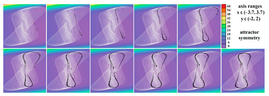 Horizontal state space slices defined by plane z = const. providing rainbow scaled dynamical energy distribution of typical chaotic attractors of case Ψ6 system (white state trajectory), associated Poincaré sections (black dots). Figures sorted from left to right and up to down are given by: z =−3.3, z = −2.7, z = −2, z = −1.2, z = −0.7, z = 0, z = 0.4, z = 1, z = 1.7, z = 2.3, and z = 3.3.